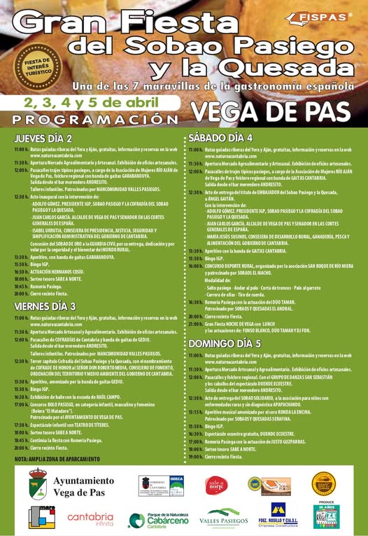 12:00 h.  Pasacalles de trajes típicos pasiegos a cargo de la Asociación de Mujeres Río Aján de Vega de Pas, folclore regional con banda de gaitas Garabanduya.